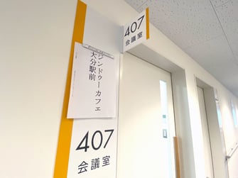 会場の入口の「ジンドゥーカフェ大分駅前」の表示が目標です。